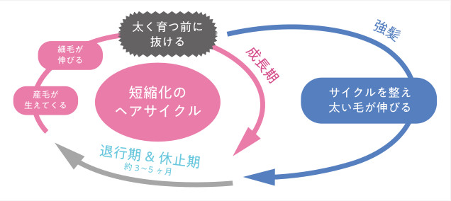 毛髪にはこのように伸びて抜ける周期(ヘアサイクル)がありますが、このヘアサイクルが乱れ、太く育つ前に抜けてしまう事で薄毛へとつながります。